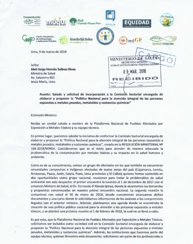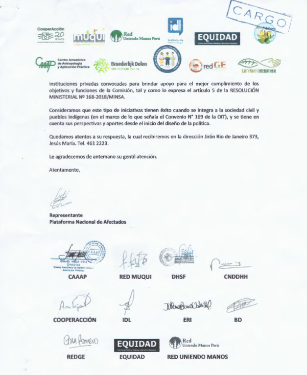Carta enviada por plataforma de afectados y organizaciones de la sociedad civil al MINSA
