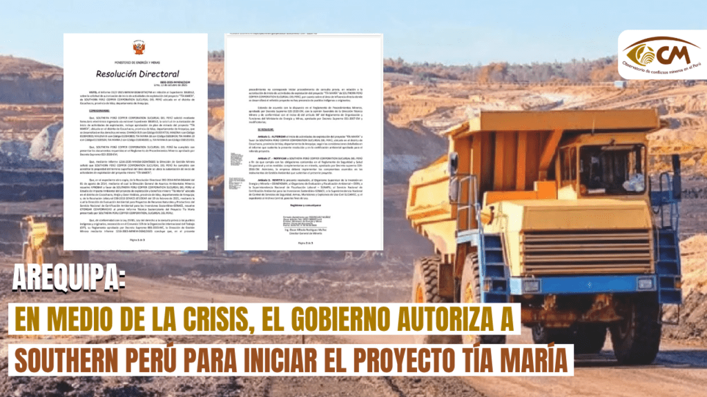 En medio de la crisis política, el Gobierno de Perú otorgó a Southern Perú Copper Corporation la autorización oficial para iniciar las actividades de explotación del proyecto cuprífero Tía María, ubicado en el distrito de Cocachacra, provincia de Islay, región Arequipa.